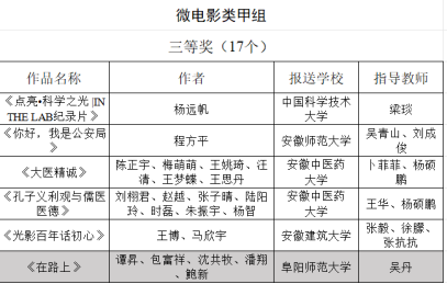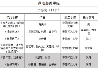 近日,安徽省教育厅公示了第七届大学生艺术展演活动各项目的评选结果,文学院2020级网络与新媒体专业学生喜获艺术作品类(微电影)省级二等奖2项,三等奖1项。