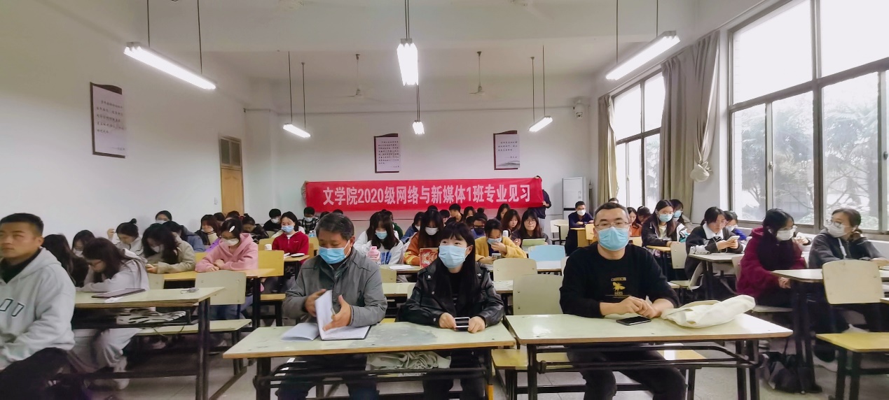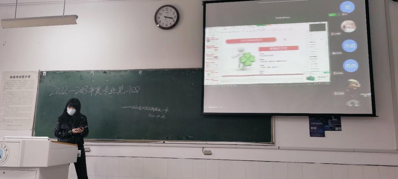 10月26日下午,2020级网络与新媒体1班全体学生于景行楼104教室进行线上见习。阜阳在线新闻网邹月明担任主讲人,文学院新闻系教师段宗明和闫允丽在现场有序组织活动开展。