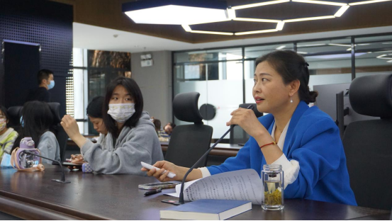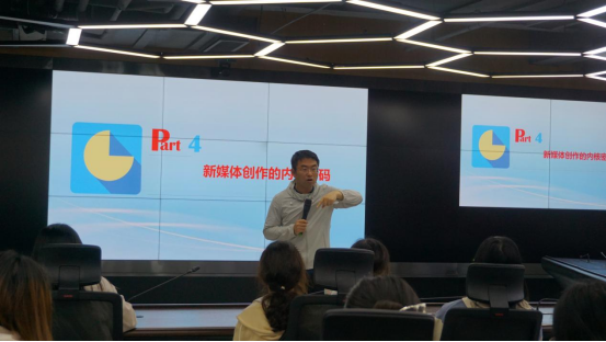 在湖景会议室,李跃波老师以“新媒体创作的核心密码”为主题,提出未来新媒体人才重要是创意,关键是创新,并向同学们介绍新媒体所需的信息含量、情感含量、价值含量。朱芳老师则从“视、听、旨、趣、美”五个方面解说新闻短视频制作的核心要素,指出短视频制作主旨是第一要素,视、听是载体,趣、美是佐料,一切为主旨服务。