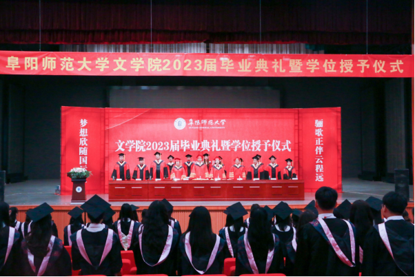 人间五月天,浅夏胜春烟,别离意正浓。5月28日上午,文学院2023届毕业典礼暨学位授予仪式在阜阳师范大学体育中心举行。文学院党委书记陈旭阳、院长高群、副书记徐春婷、副院长尹奇岭,专业负责人刘洪宇、刘海明、吴启祥,教师代表郭世轩,硕士生导师代表石耀华,相关辅导员以及文学院2023届毕业生参加典礼,同时还邀请了2020届、2021届和2022届毕业生参加典礼。本次典礼由院党委副书记徐春婷主持。