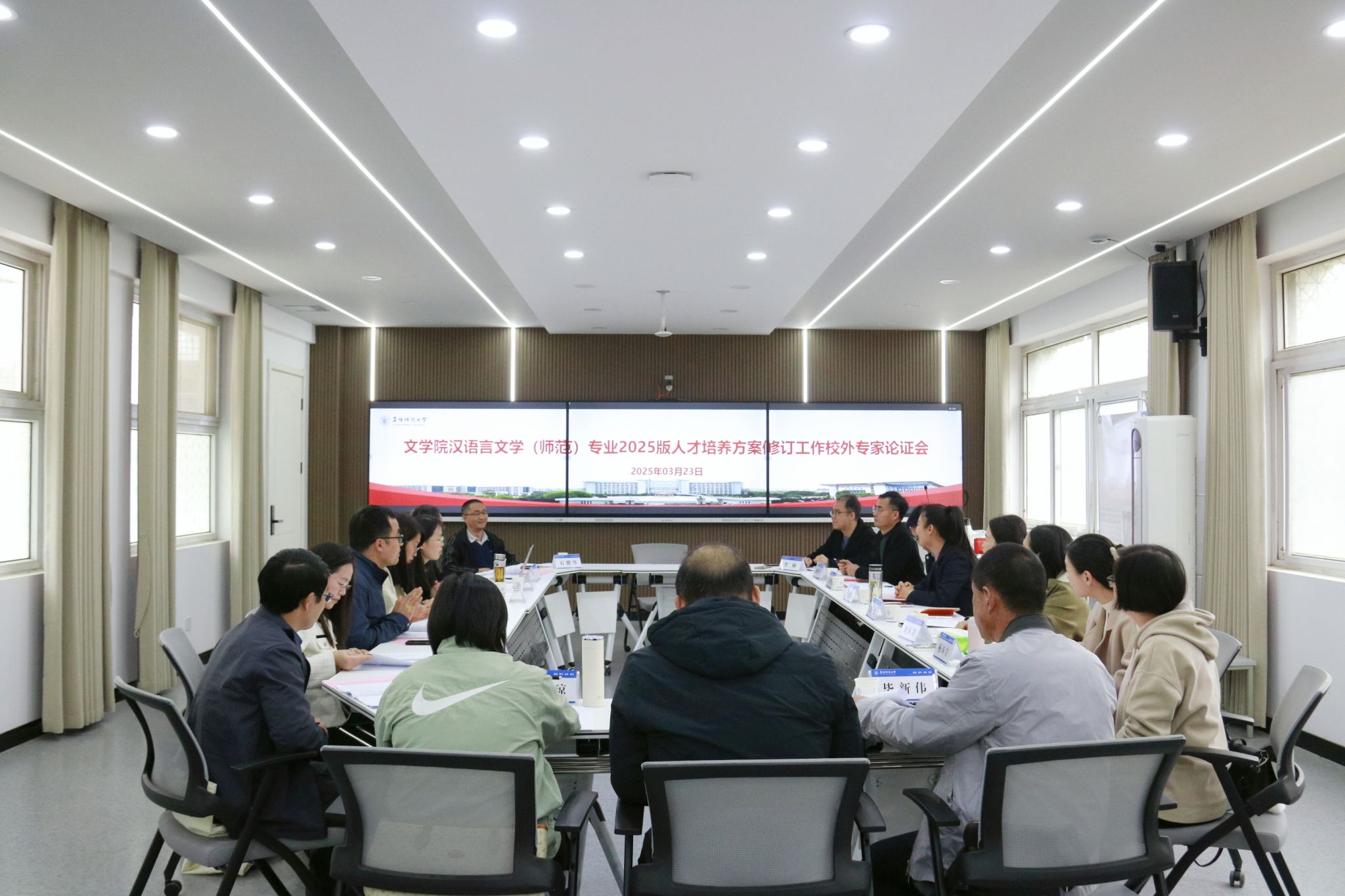 为更好地适应新时代教育发展的需求,精准对接基础教育改革新要求,全面提升汉语言文学(师范)专业人才培养质量,3月23日上午,文学院在西湖校区三区B楼103室召开汉语言文学(师范)专业2025版人才培养方案修订工作校外专家论证会。本次会议特邀来自芜湖一中、阜阳一中、阜阳二中、阜阳三中、颍上一中、阜阳十九中、阜阳一初、阜阳师范大学附属颍上第一中学、阜阳师范大学附属西清路中学、师大附中等基础教育一线的近20位语文教学专家参与研讨。文学院汉语言文学专业负责人李帅、学科教学(语文)硕士点负责人石耀华以及各教研室主任参加会议。会议由文学院副院长张薇薇主持。