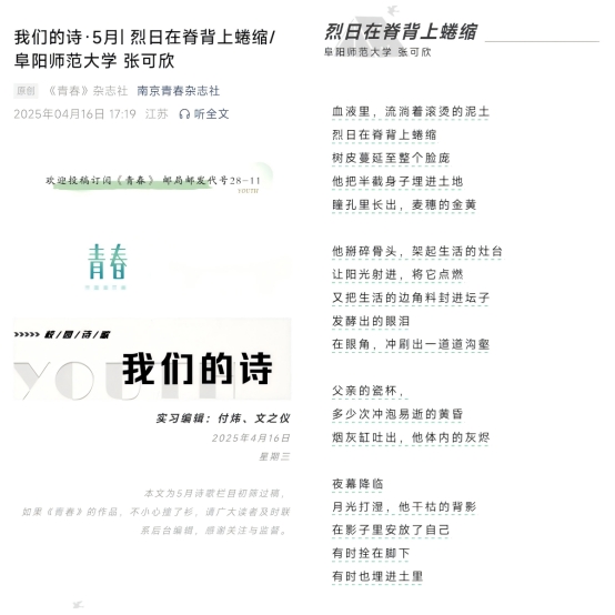 一直以来,文学院致力于构建全方位的人才培养体系,不仅在专业课程设置上注重理论与实践相结合,还积极组织各类文学活动,如文学讲座、征文比赛等,持续打造“悦读文院”学生品牌系列活动,引导学生深度阅读经典,激发学生的文学创作热情与创新思维,为学生搭建起一个多元的学习交流平台。此次张可欣在《青春》杂志发表作品,正是文学院人才培养成果的有力见证。