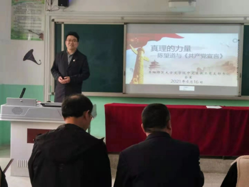 “什么是真理的力量?”在阜阳市临泉县韦寨小学的教室里,阜阳师范大学文学院中文系教工党支部书记金星正在生动地给韦寨小学全体教职工讲述着陈望道先生与《共产党宣言》的故事。