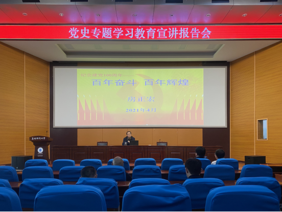 为庆祝中国共产党百年华诞,贯彻落实习近平总书记在党史学习教育动员大会上的重要讲话精神,4月28日下午,文学院联合外国语学院共同开展党史学习教育专题宣讲报告会,诚邀我校教学管理处处长房正宏,以“百年奋斗 百年辉煌”为题,为参会人员上了一堂生动而又深刻的党史课。我院全体教职员工参加了此次专场报告。