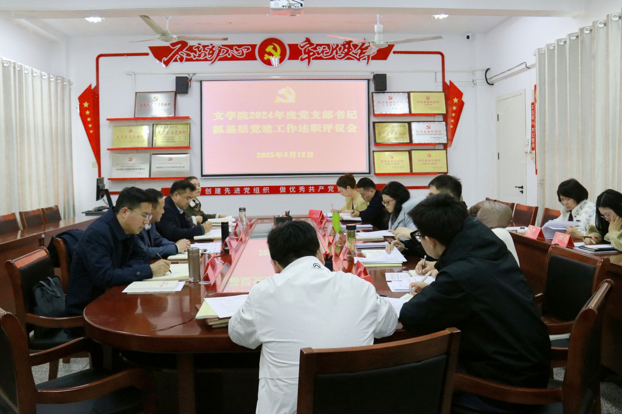 为深入学习贯彻习近平新时代中国特色社会主义思想,全面贯彻落实党的二十大和二十届二中、三中全会精神,全面落实新时代党的建设总要求,3月12日下午,文学院在西湖校区三区B楼105会议室召开2024年度党支部书记抓基层党建工作述职评议会。文学院党政领导班子成员、党委委员、全体党支部书记及学生党员代表参会。会议由文学院党委书记王清主持。