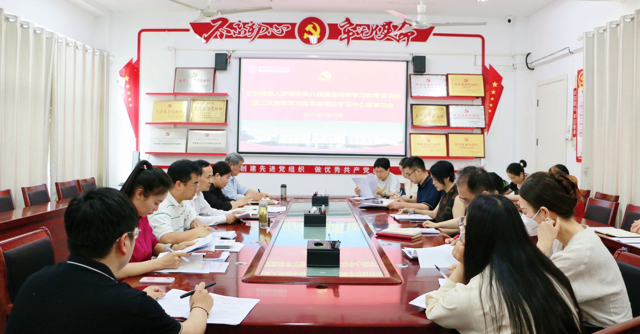 5月21日下午,文学院在西湖校区三区B楼104会议室举办深入贯彻中央八项规定精神学习教育读书班第二次集体学习暨党委理论学习中心组学习会。文学院党政领导、党委委员、党支部书记、科级干部参加学习。会议由文学院党委书记王清主持。