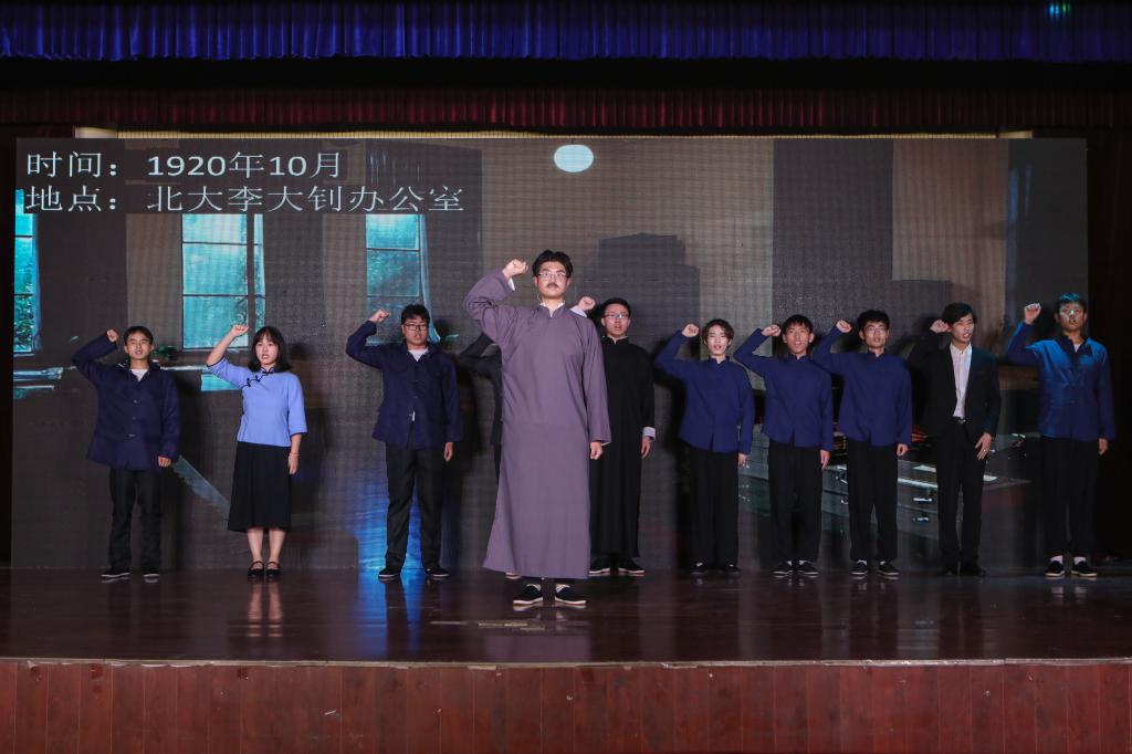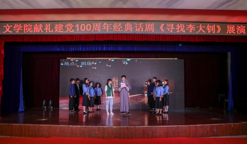 为庆祝中国共产党成立100周年,6月27日晚,由文学院党委主办,文学院团委和文学院九歌剧社承办的经典话剧《寻找李大钊》展演活动在景行楼报告厅举行。校党委副书记涂红松、校办公室主任檀竹茂、校宣传部部长王清、校学工部部长黄正杰、校教育集团党委书记王健、文学院党委书记陈旭阳、文学院院长高群、文学院党委副书记徐春婷、校学工部老师李方、九歌剧社指导老师魏锦虹与学生们一起观看了演出。