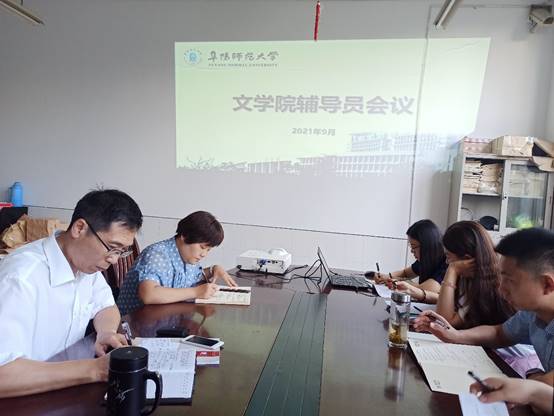 2021年9月30日下午,文学院在景行楼106举行职业规划课程集体备课暨就业工作交流会。会议由文学院党委书记陈旭阳主持,院党委副书记徐春婷及全体辅导员参会。