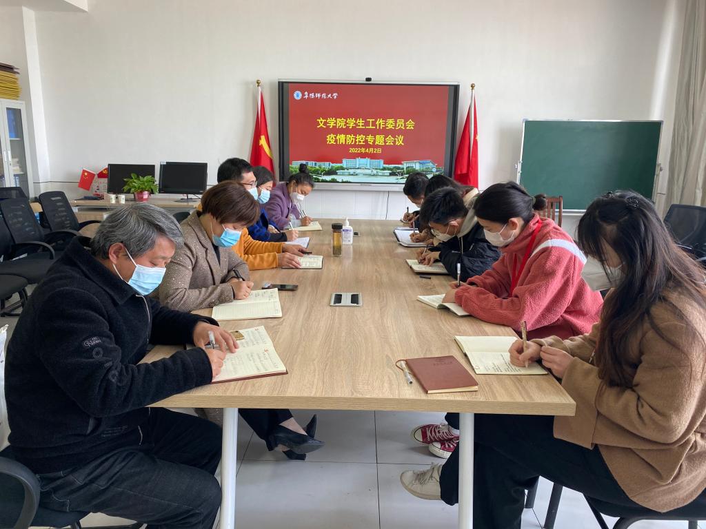 阜阳市近期疫情点多、面广、频发,学校疫情防控工作压力持续增大,周边疫情形势严峻复杂。为推进疫情防控工作更加细致务实,4月2日中午,文学院召开疫情防控工作专题会议,研究近期疫情防控工作,文学院领导班子和全体辅导员参加会议。