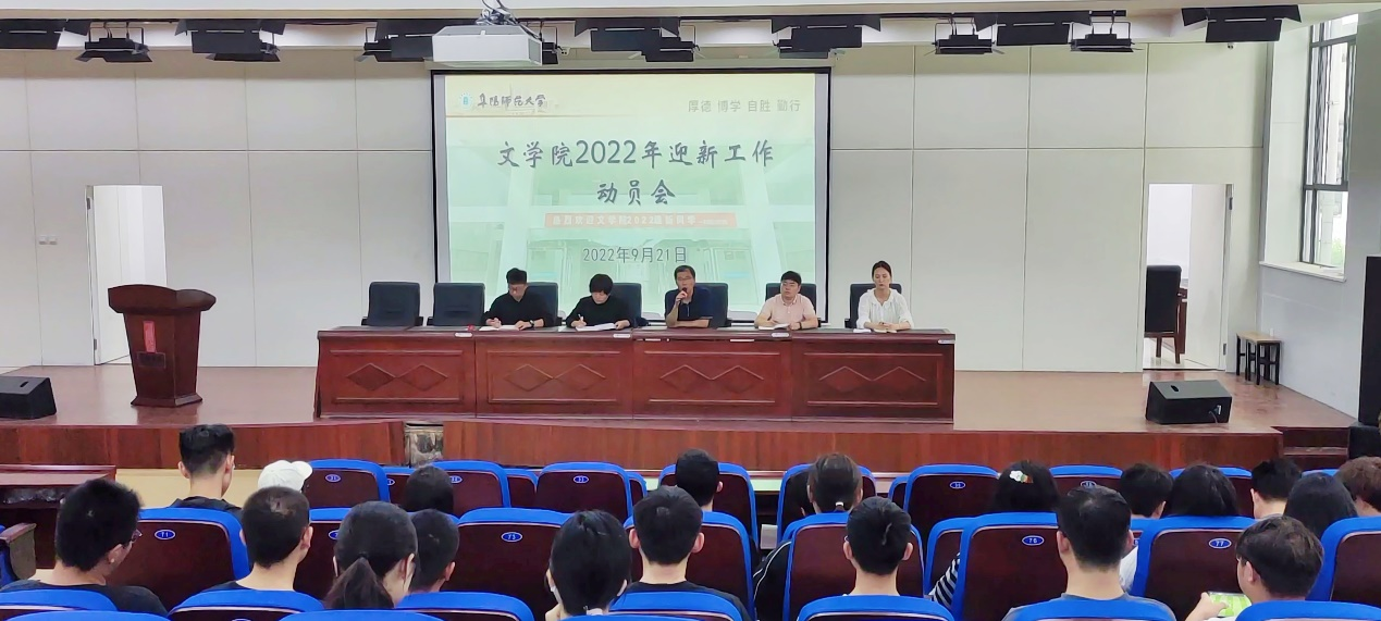 为落实好迎新工作的具体要求,更好地服务2022级新生,9月21日下午,文学院于汉风楼一楼报告厅召开此次迎新工作动员会。文学院书记陈旭阳,副书记徐春婷,团委负责人尚志会,新生辅导员王洋、马旖雯,新生辅导员助理,团委学生会工作人员和全体志愿者参加本次会议。