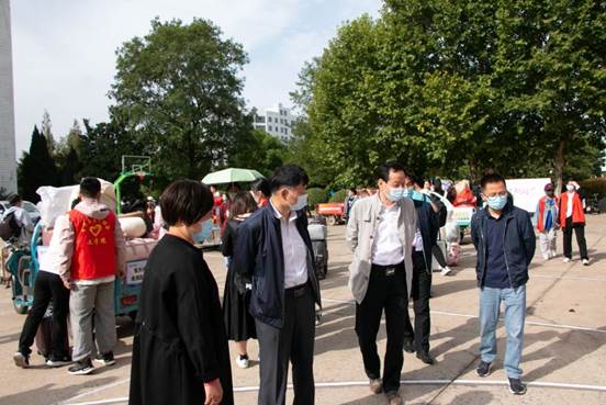 上午,学校和学院领导来到了迎新现场,看望前来报道的工作人员,亲切慰问了工作人员和迎新志愿者,了解新生报到及疫情防控工作开展情况,并对迎新工作进行指导。