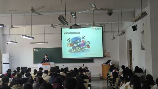 主讲人戎晓晴以电信诈骗为切入点,为学生发放宣传手册,详细介绍了当下电信网络诈骗的多种形式,生动形象地解析了网络兼职刷单类、冒充客服类、虚假网络贷款类、网络游戏虚假交易类、冒充公检法类等诈骗类型的作案手法,并重点强调了大学生参与校园贷的危害,呼吁同学们保护自己的财产安全,远离非法校园贷。