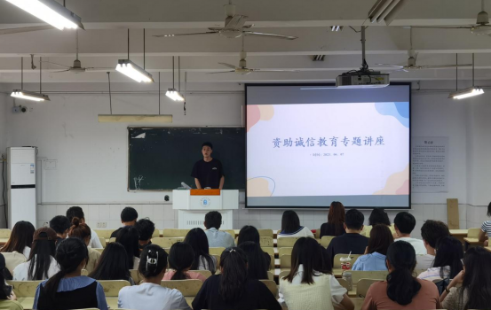为提高学生诚信意识,突出育人导向,将学生资助工作与思想教育工作紧密结合,实现从资助自助到助人育人的转化,文学院以班级为单位,围绕“诚信感恩,励志笃行”主题开展了班会活动,宣讲诚实守信事迹,倡导契约精神,充分挖掘资助典型、树立榜样,促使学生树立诚信观念、增强法律意识;举办诚信、金融知识讲座,讲解助学贷款办理及还款流程,普及预防金融诈骗、电信诈骗和违法高利贷等方面知识,切实提高学生的金融安全防范意识。