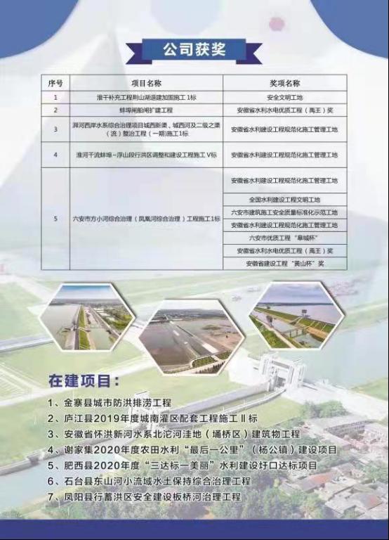 公司本着“团结、奋进、开拓、创新”的企业精神,面向市场,深化改革,强化管理,实现快速、健康、稳定的发展,公司通过ISO9001、ISO14001、OHSAS18001三大体系认证、被评委安徽省水利建设市场信用等级AAA级企业、中国水利工程协会信用等级AA级企业、安徽省守合同、重信用单位,获得安徽省水利水电行业协会副会长单位称号。