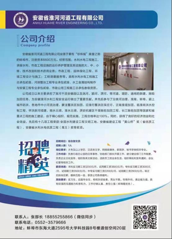 安徽省淮河河道工程有限公司坐落于素有“珍珠城”美誉之称的蚌埠市,注册资本6600万元,经营范围:水利、水电工程施工,承接水利、市政工程设施的运行养护管理及其设施的大、中、小修,技术改造和技术咨询业务;市政工程、园林绿化工程、环境工程设计与施工;工程测量服务;水环境治理;土壤修复;水土保持技术咨询、技术服务。具有水利水电工程施工总承包贰级资质、河湖整治工程专业承包贰级资质、水工金属结构制作与安装工程专业承包贰级资质、市政公用工程施工总承包参级资质。