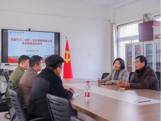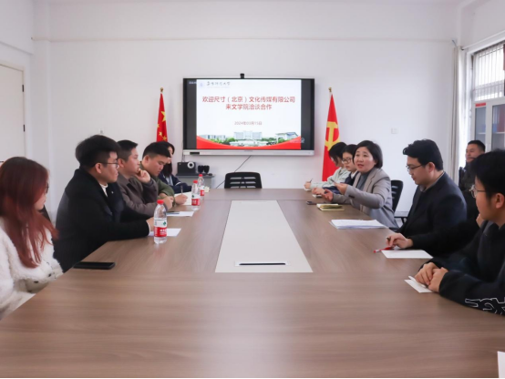 陈旭阳首先代表文学院对魏占营一行的到访表示热烈欢迎。他从师资队伍、人才培养、学科建设、合作经验、未来发展等方面介绍了文学院基本情况,并提出校企合作诉求。魏占营代表企业感谢学院提供的人才支持,并简要介绍了企业自2015年成立以来的发展历程、生产经营以及人才培养,并表达公司与学校深度合作、共谋发展的美好意愿。