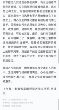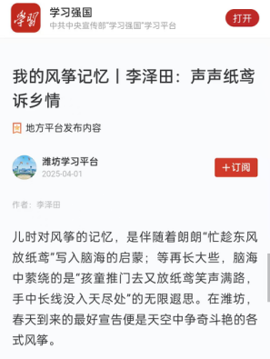 4月1日,“学习强国”潍坊学习平台刊发了文学院研究生李泽田的作品《声声纸鸢诉乡情》,此文系“学习强国”潍坊学习平台“我的风筝记忆”主题征文入选作品,也是我院学生首次在“学习强国”平台独立刊发的文章。