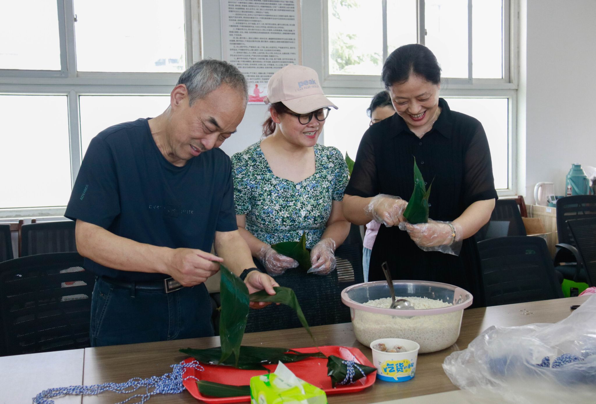 活动伊始,教职工齐聚拍照留念,记录这一温馨时刻。在包粽子环节中,教职工们互相交流包粽技巧,卷粽叶、填糯米、扎棉线,动作娴熟,一气呵成。魏文霞在一旁耐心指导,现场氛围浓烈,温馨融洽。