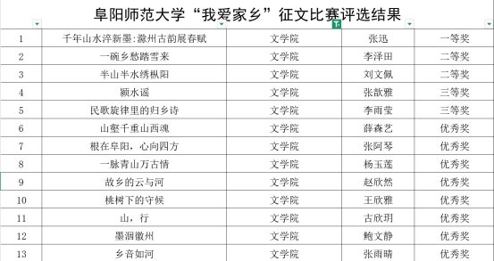 我院学子将专业学习与情感教育深度融合,用文字描绘家乡风貌。学院报送13篇作品,经学校评选,比赛结果于近日揭晓。文学院学子凭借扎实的文学素养与真挚的情感表达脱颖而出,2023级汉语言文学(师范)4班张迅等13人获奖,一等奖1人、二等奖2人、三等奖2人、优秀奖8人。这一成绩充分展现了我院学子在人文教育方面的扎实成效。
