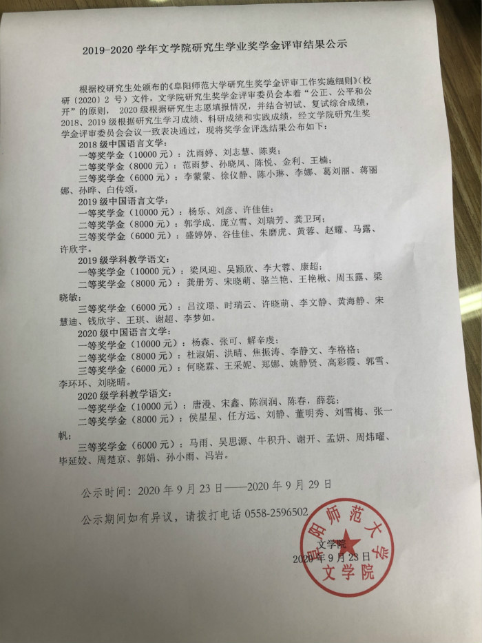 2019-2020学年文学院研究生学业奖学金评审结果公示