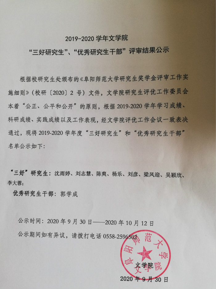 2019-2020学年研究生“三好”研究生、研究生干部公示