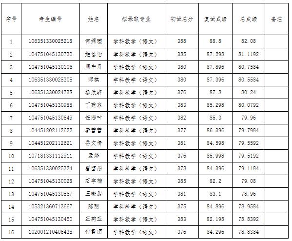 根据教育部办公厅《 2021年全国硕士研究生招生工作管理规定》(教学函〔2020〕8号)、教育部《关于做好2021年全国硕士研究生招生录取工作的通知》(教学司〔2021〕2号)等文件精神,按照安徽省2021年硕士研究生招生录取工作会议要求、阜阳师范大学2021年硕士研究生复试录取工作方案。现将我院2021年学科教学(语文)第二批全日制硕士研究生拟录取名单公示如下:
