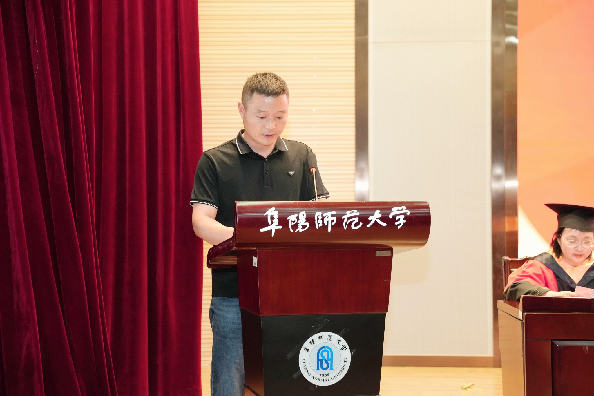 家长代表魏元林感谢学院的培育,让孩子在收获温暖与善良,拥有知识与思想的力量,鼓励毕业生奔赴远方,追逐理想之光。