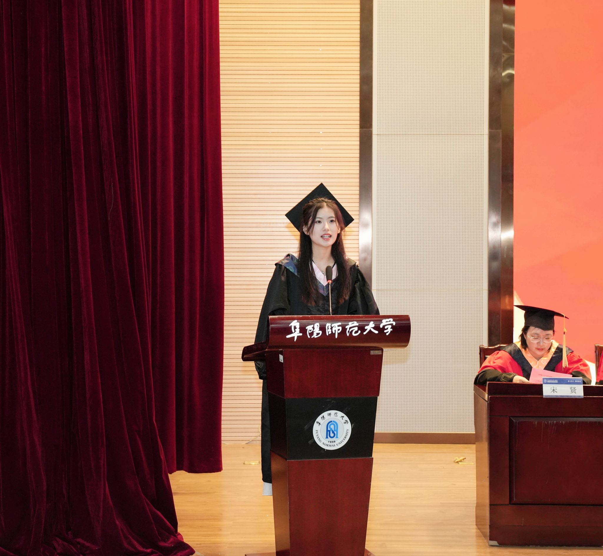 本科毕业生代表徐冉回溯求学之路,感谢学校、学院及老师的培育,分享面对挑战时的坚持,呼吁大家以严谨态度与家国情怀追逐理想;研究生毕业生代表崔璨从论文写作、校园文化活动等方面,讲述在学院的成长,感念师者的悉心指导。