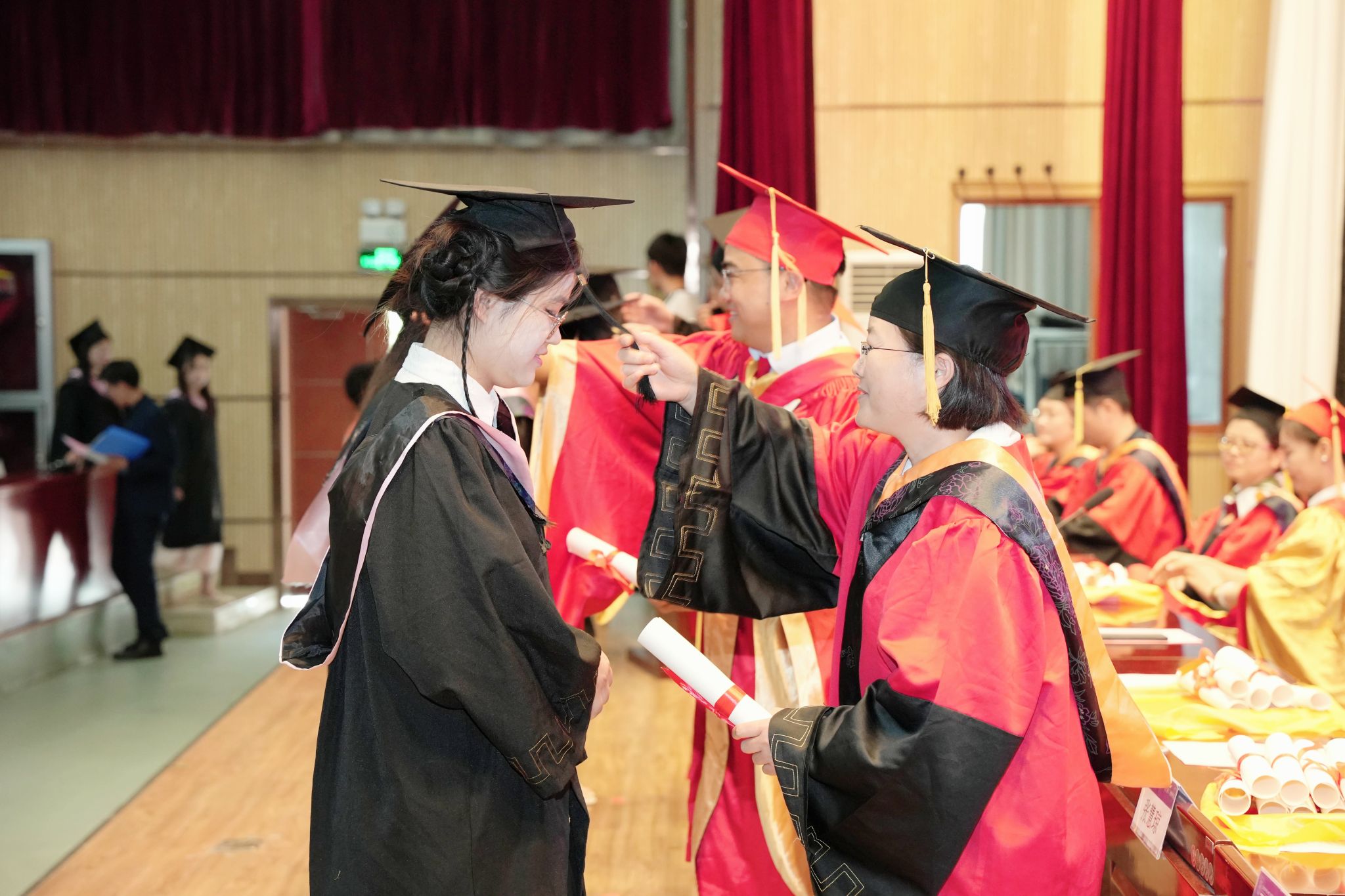 学院领导与教师们为毕业生逐一拨正流苏并合影留念,庄重的仪式象征着学业的圆满与新征程的开启。