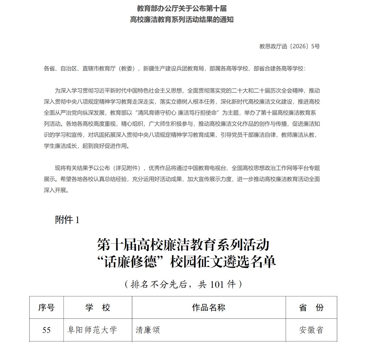 近日,教育部公布第十届高校廉洁教育系列活动优秀成果名单,我院学生王睿创作的征文作品《清廉颂》获评教育部第十届高校廉洁教育系列活动“话廉修德”校园征文优秀作品,这既是对学子个人创作能力与思想素养的高度肯定,更是学院厚植廉洁育人、践行立德树人的生动实践。