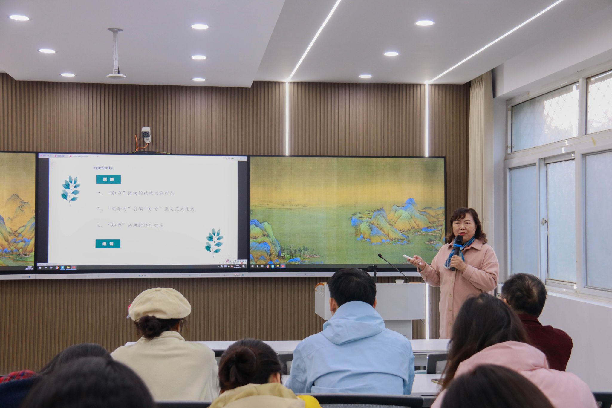 祝克懿教授以互文范式为研究视角,以“X+力”结构语义的急剧演化为例,从多个层面探讨了修辞与语块词汇之间的互动。祝克懿教授通过生活中丰富多彩的鲜活词汇语料,分析了“X+力”由工商管理学科、心理学科逐步进入到人文社科领域的过程,提出“X+力”语块作为一种结构功能单位和嵌套互文结构,在结构生成、功能表征的演化路上迸发出强盛的语言生命力。在互动交流环节中,祝克懿教授结合国内外顶级期刊和著作中的前沿理论耐心解答师生们的疑问,启发大家在学术研究中要有全球化前沿的视野。现场气氛热烈,最后讲座在听众们阵阵掌声中结束。