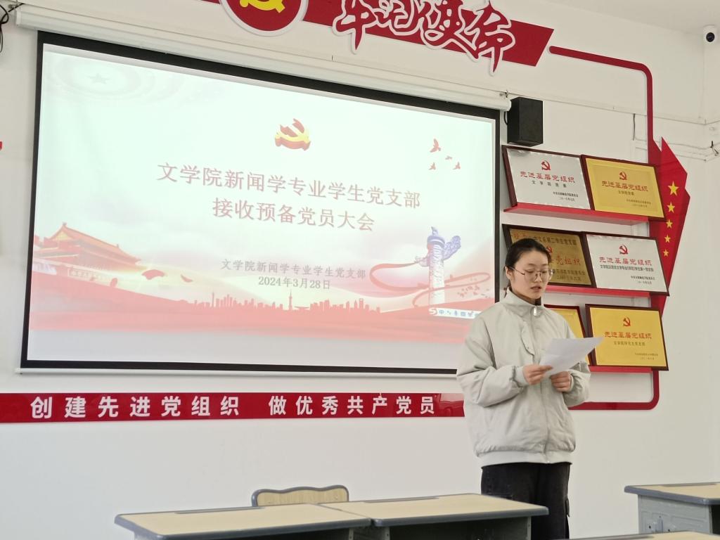 为进一步壮大党员队伍,凝聚组织力量,2024年3月28日,文学院新闻学专业学生党支部于文学院B105党员活动室召开预备党员接收大会。文学院新闻学专业学生党支部书记马旖雯及全体支部成员参加会议。