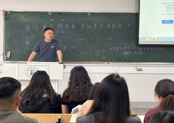为深入学习贯彻习近平新时代中国特色社会主义思想,以主题教育推动学院各项事业高质量发展,文学院汉语言文学专业学生第二党支部于5月27日下午在景行楼104开展“学习贯彻习近平新时代中国特色社会主义思想主题教育”专题党课暨“三问”强党性主题党日活动。党支部书记刘振撼担任主讲人,汉语言文学专业学生第二党支部全体成员参加。
