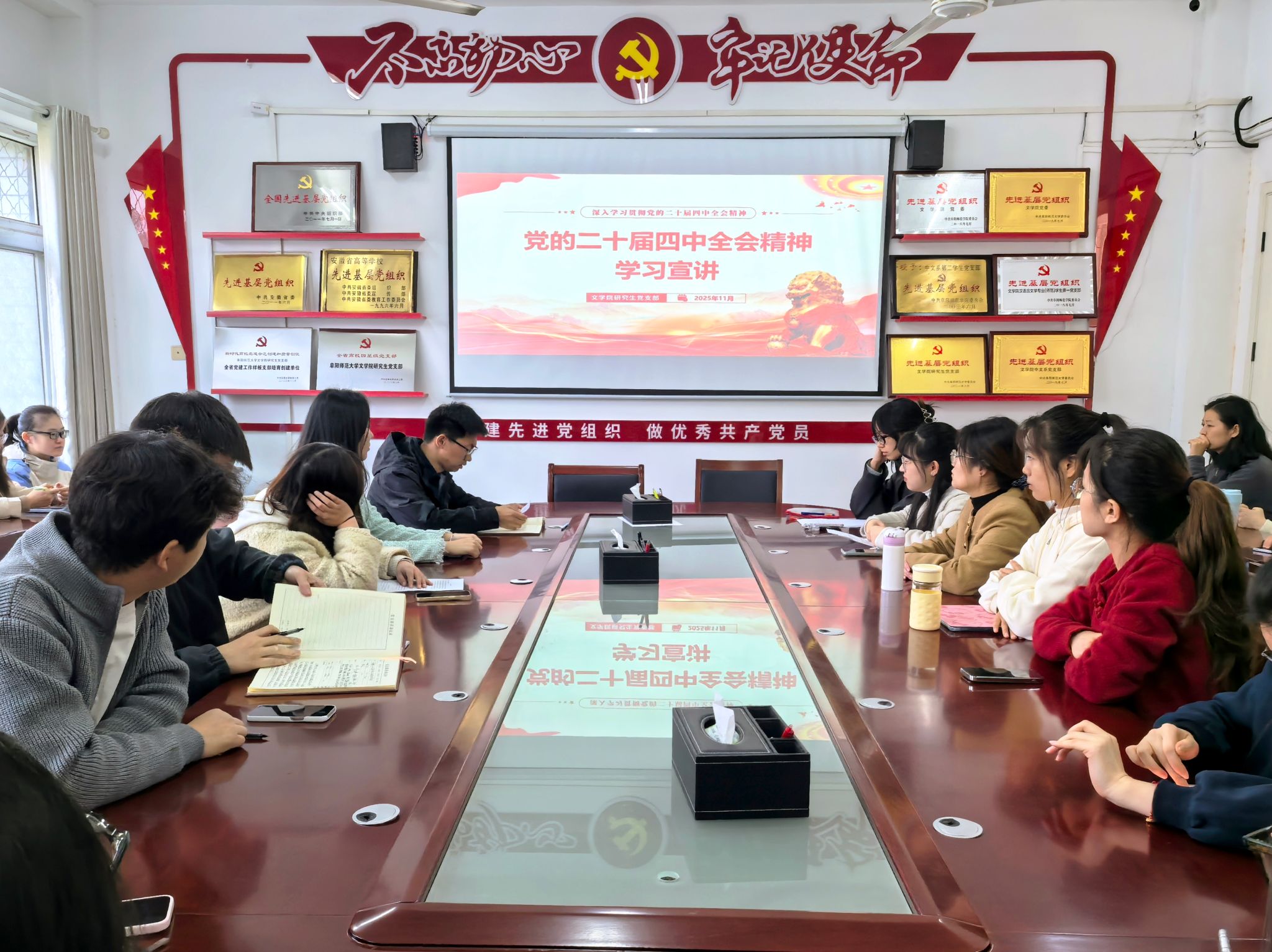 为深入学习贯彻党的二十届四中全会精神,切实把思想和行动统一到全会精神上来,11月14日下午,文学院研究生党支部在三里桥校园B104党员活动室组织开展党的二十届四中全会精神专题学习活动。支部书记尚志会主持学习,全体学生党员参加。