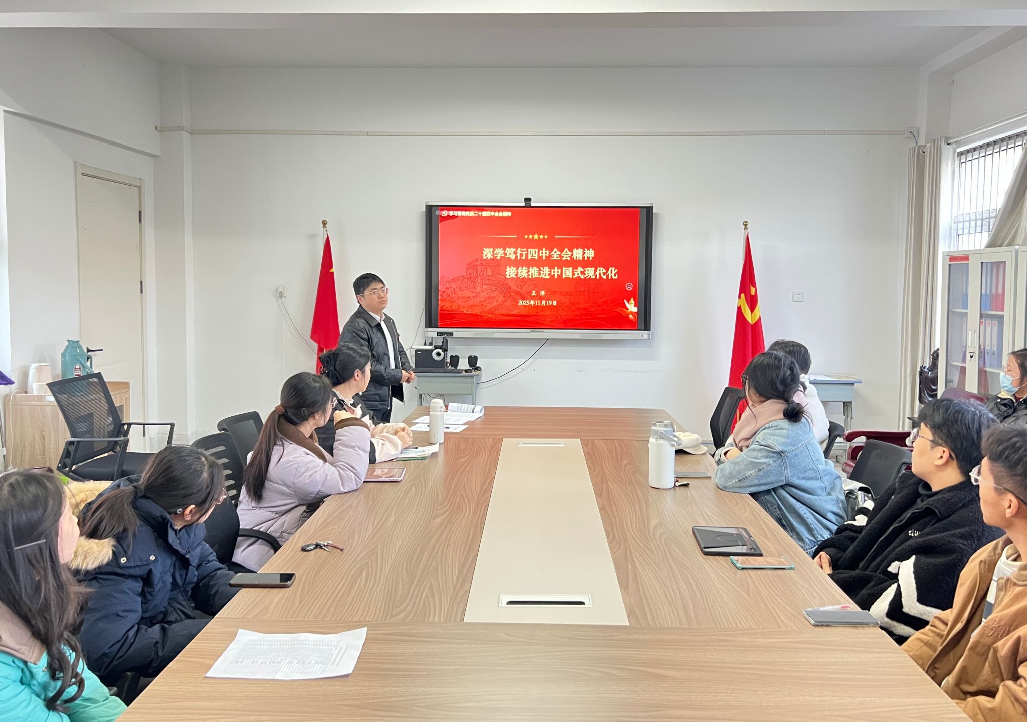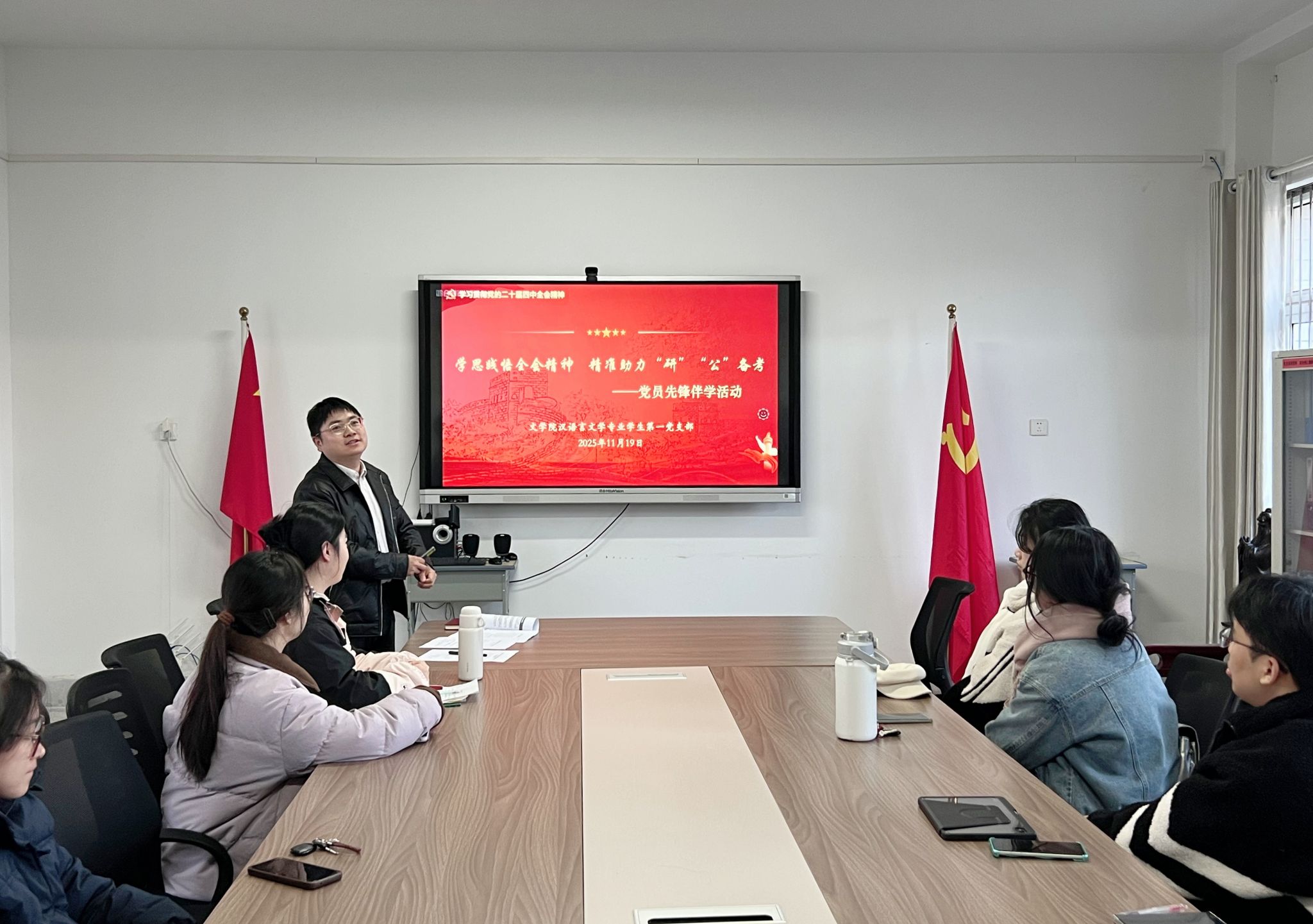 为深入学习贯彻党的二十届四中全会精神,推动理论学习与学生成长需求深度融合,充分发挥学生党支部战斗堡垒作用与党员先锋模范作用,11月19日下午,文学院汉语言文学专业学生第一党支部在学院202会议室,成功举办党的二十届四中全会精神宣讲暨“学思践悟全会精神 精准助力‘研’‘公’备考”党员先锋伴学活动。党支部书记王洋担任主讲人,支部全体党员全程参与。