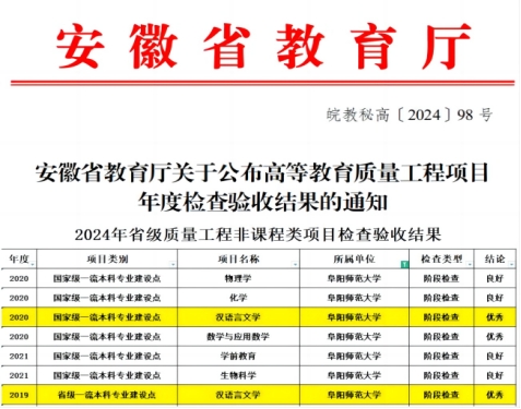 近日,安徽省教育厅下发了《安徽省教育厅关于高等教育质量工程项目年度检查验收结果的通知》,文学院汉语言文学专业国家级和省级一流本科专业建设点中期检查结果均获“优秀”。这是文学院持续推进专业建设取得的阶段性成果,标志着汉语言文学专业建设发展达到新的高度和水平。