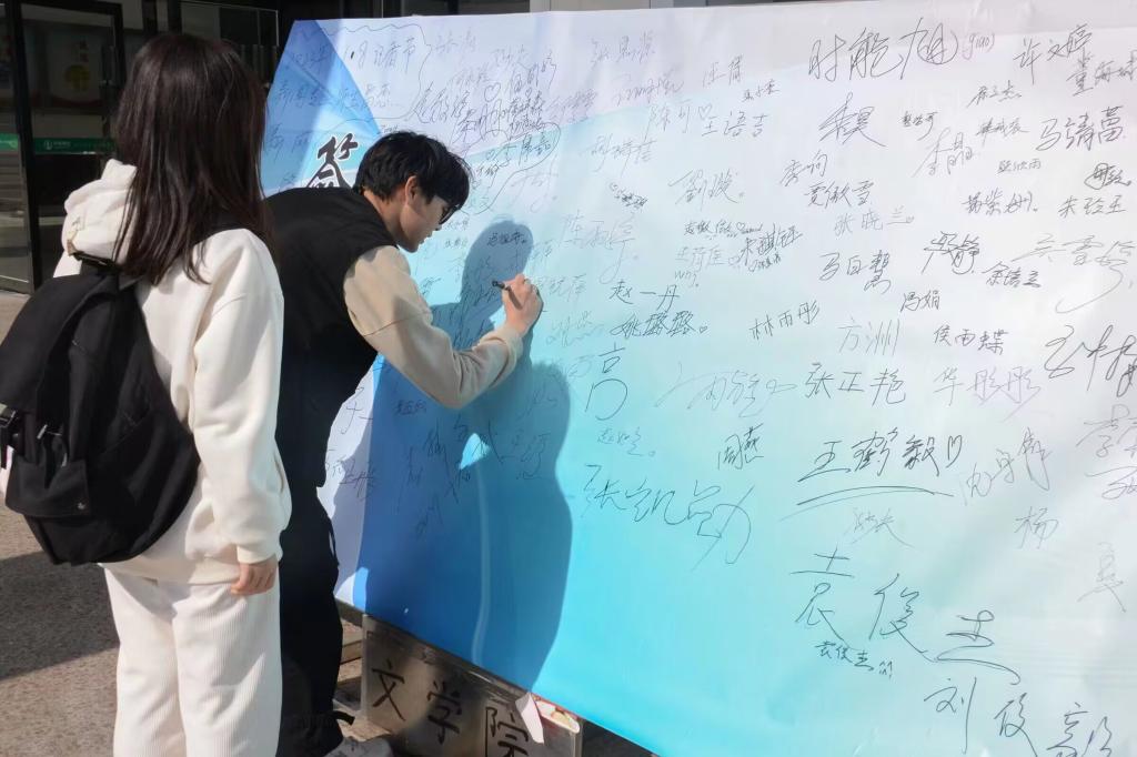 在文学院A楼门口,一面特别设立的签名墙吸引着学生们纷纷前来,签下自己的名字,并摆放了精心设计的记者节海报。每个名字都代表着学生们的个性、理想和追求。这个签名墙将成为学院里的一个特殊角落,见证着学生们的努力和付出,也让他们感受到学院和同学们的支持和鼓励。这个自由留言的互动环节,让每一个学生都感受到了自己作为一名新闻工作接班人的重要性,并且激发了他们对新闻事业的热爱。2022级新闻学2班的甘海迪在郑重地签完名字后感慨道:“在专业课上讲述的一个个坚守初心与信念的勇敢记者形象,让我钦佩与感动,就此我萌生了成为一名学生记者的信念。校园广播站的工作增强了我对文字的灵敏性、对内容的严谨性,让我收获颇多。未来,我也会带着初心继续前行。”