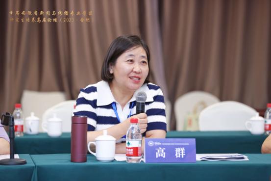 论坛圆桌会议环节,阜阳师范大学文学院院长高群教授与安徽大学新闻传播学院院长姜红教授、安徽师范大学新闻与传播学院院长马梅教授等省内兄弟院校负责人就新闻与传播专业学位研究生培养方案制定、毕业考核方式创新、实习见习安排、双导师制度设置等现实问题展开深入研讨。高群教授介绍了我校新闻传播学系本科和硕士的专业设置、学科特色、师资力量、招生概况,希望以此次论坛为契机,与省内兄弟院校进一步深度交流,能够做到资源共享、优势互补,形成学科发展共同体,实现团结协作、共同进步。
