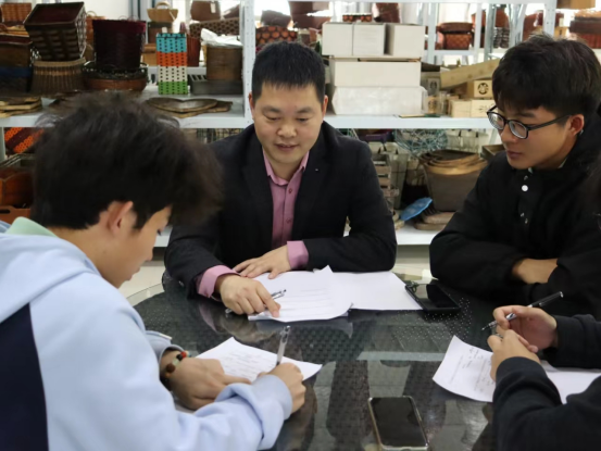 团队来到阜南县黄岗镇柳编协会,对柳编的生产、加工、出口等情况进行深入调研。在调研会上,双方人员围绕传承非遗柳编问题展开会谈。阜南县柳编协会秘书长郑洪洲和柳编企业马经理听取了杨柳岸编团队的项目建设情况,给予充分肯定并提出宝贵意见。