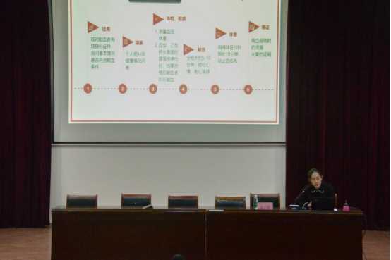 为进一步弘扬志愿服务精神,提升无偿献血知识普及率,增强大学生的社会责任感,11月15日下午,文学院于西湖校区三区D楼报告厅开展无偿献血进校园宣讲活动。文学院党委书记陈旭阳、阜阳市中心血站站长郭国伟、副站长徐雷出席本次活动,阜阳市中心血站工作人员沈小婷进行宣讲。