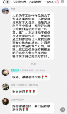 本次活动以“妙手拾趣,乐享时光”为主题制作手工,对于制作材料不限、形式不限,激发了社团成员的想象力,鼓励社员大胆想象、认真创作,调动了社团成员们的积极动手能力。社团成员们大胆发挥,创作出了一件件精美的作品,富有想象力。有的用棉签制作成雪花,寄托着对雪的期待;有的用银杏叶做成大树,十分生动;有的用扭扭棒或者毛线制作和编制出手工花朵,一个个都栩栩如生;还有的自己缝制可爱的小挂件,体现了社团成员们的乐趣童心……社团成员们完成制作后,纷纷将自己的作品拍照上传至群相册。活动最后,指导老师尹晶晶对于社团成员们提交的作品进行指导,社员们热情回应,并许诺会继续努力,争取做到更好。