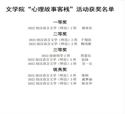 为提高大学生的心理素质,展现新时代青年感悟生活、热爱生活的精神风貌和青春活力。4月22日下午3点,文学院心理委员联合会于正行楼604教室举行了以“心语心愿,畅谈青春”为主题的“心理故事客栈”活动,文学院2022级与2021级部分同学参与。