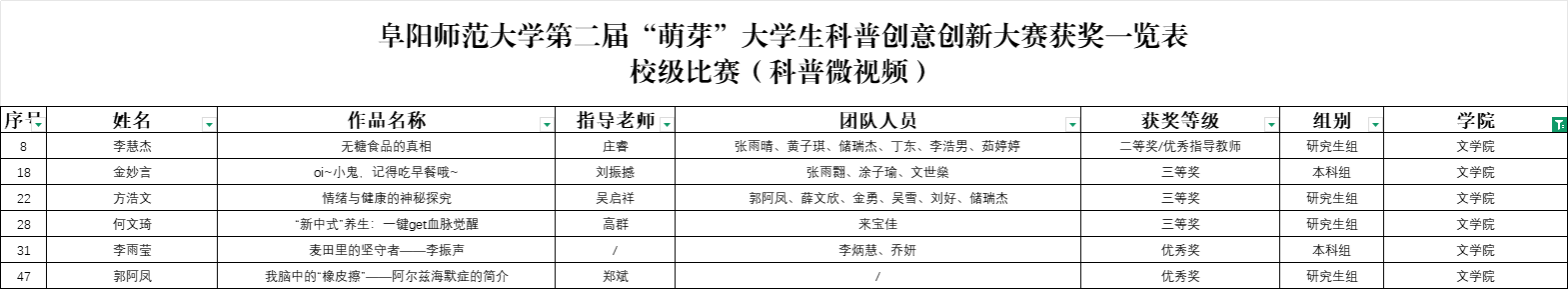 近日,我校第二届大学生科普创意创新大赛圆满落幕,文学院在本次大赛中表现突出,获评科普微视频奖项6项、科普征文奖项15项和优秀指导教师5人,并获大赛集体奖“萌芽杯”。