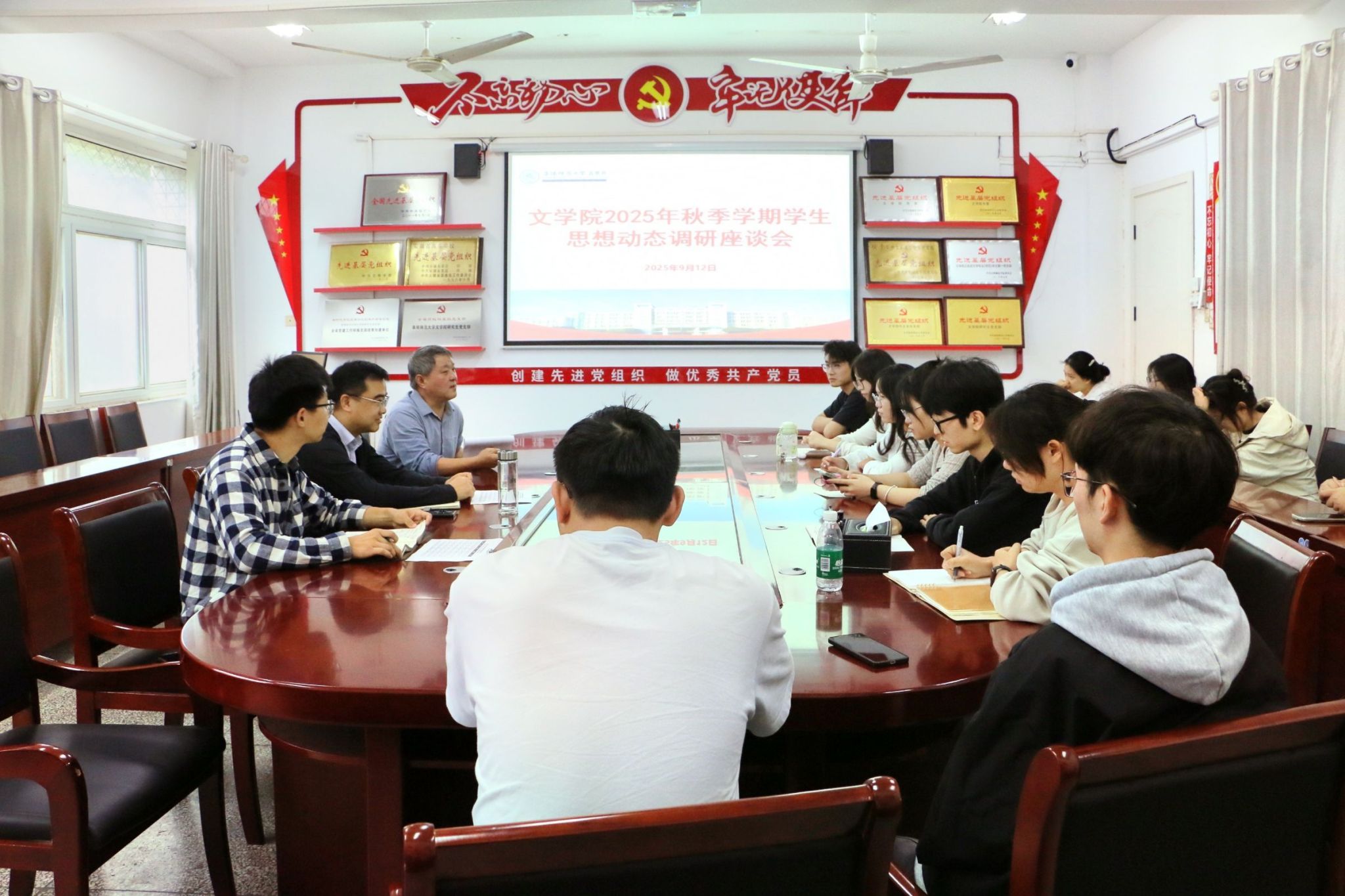 9月12日上午,文学院于西湖校区三区B楼104室召开2025年秋季学期学生思想动态调研座谈会。文学院党委副书记任竹良、副院长尹奇岭和各年级学生代表共同参会。座谈会由文学院团委负责人尚志会主持。