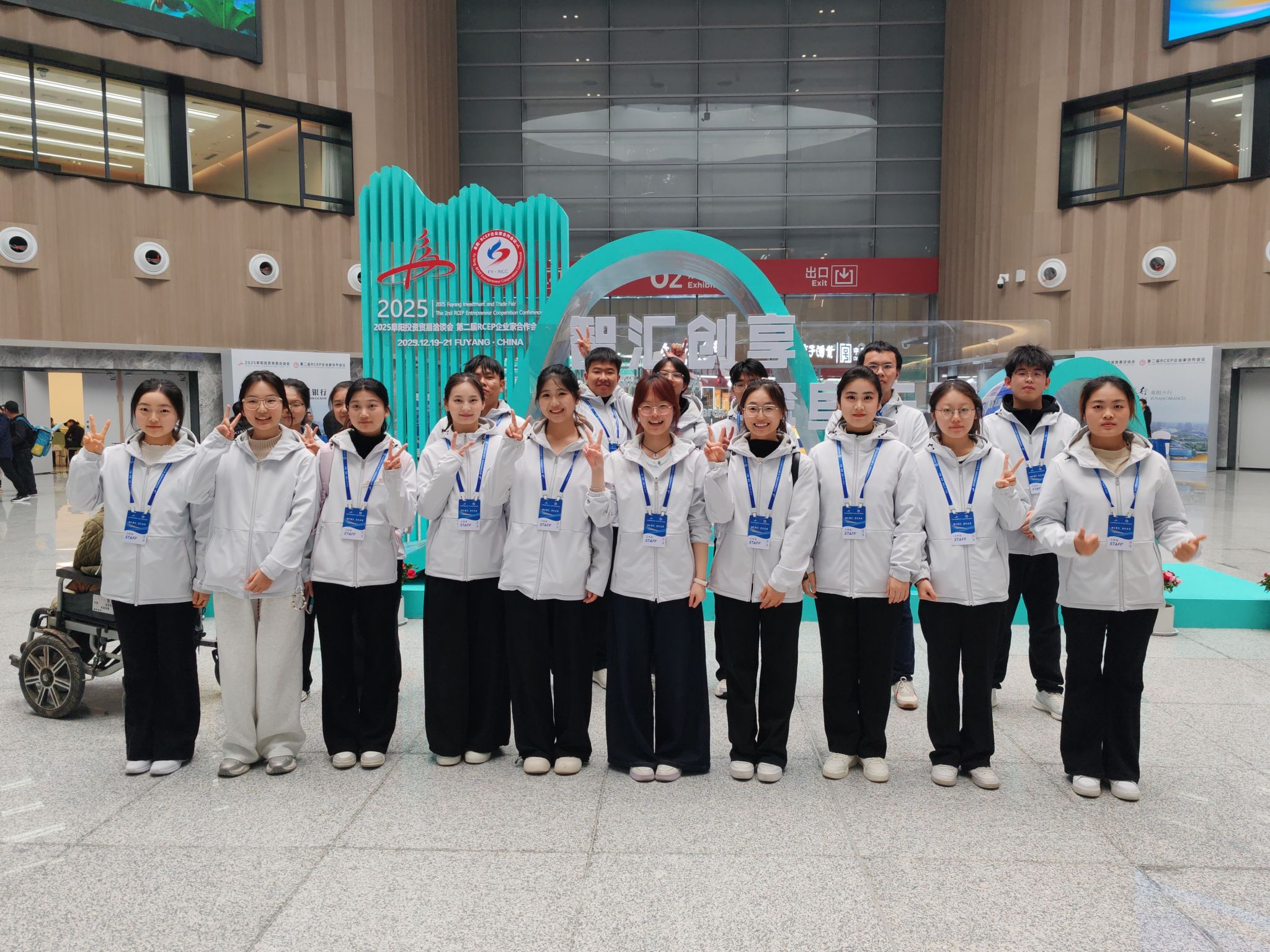12月20日,2025阜阳投资贸易洽谈会、第二届RCEP企业家合作会议在阜阳会展中心盛大开幕。应阜阳市邀请,文学院选派36名志愿者全程参与本次大会志愿服务。从12月17日至21日,志愿者们以饱满的热情和专业的服务,助力大会各项活动平稳有序开展,圆满完成志愿服务任务。