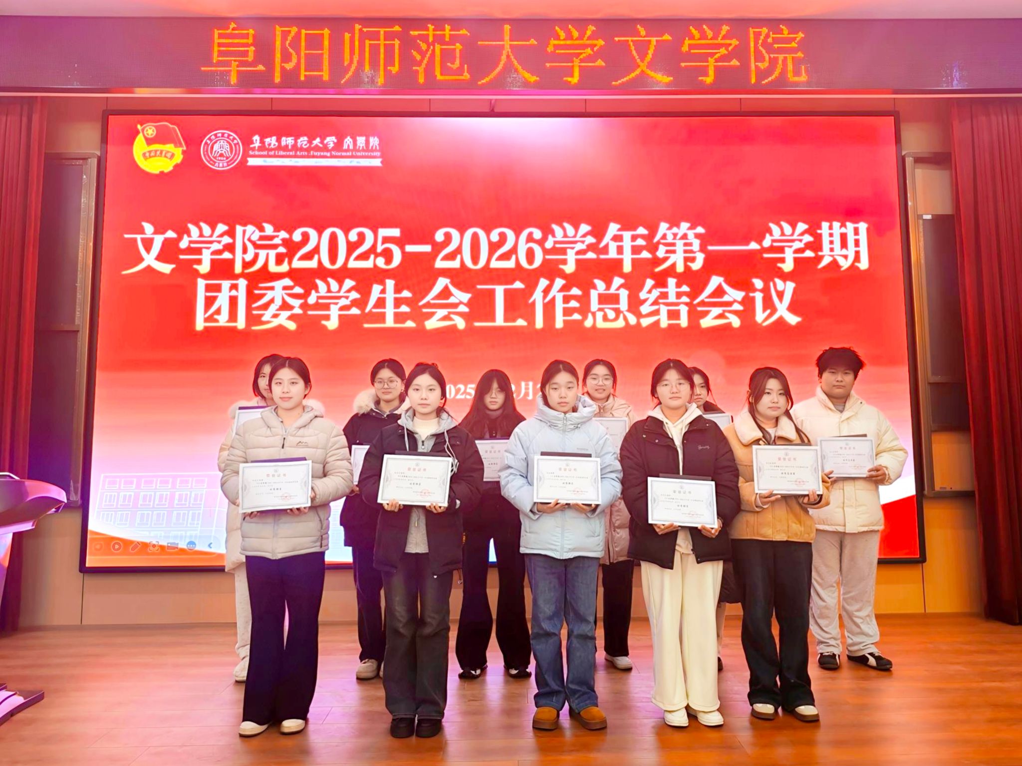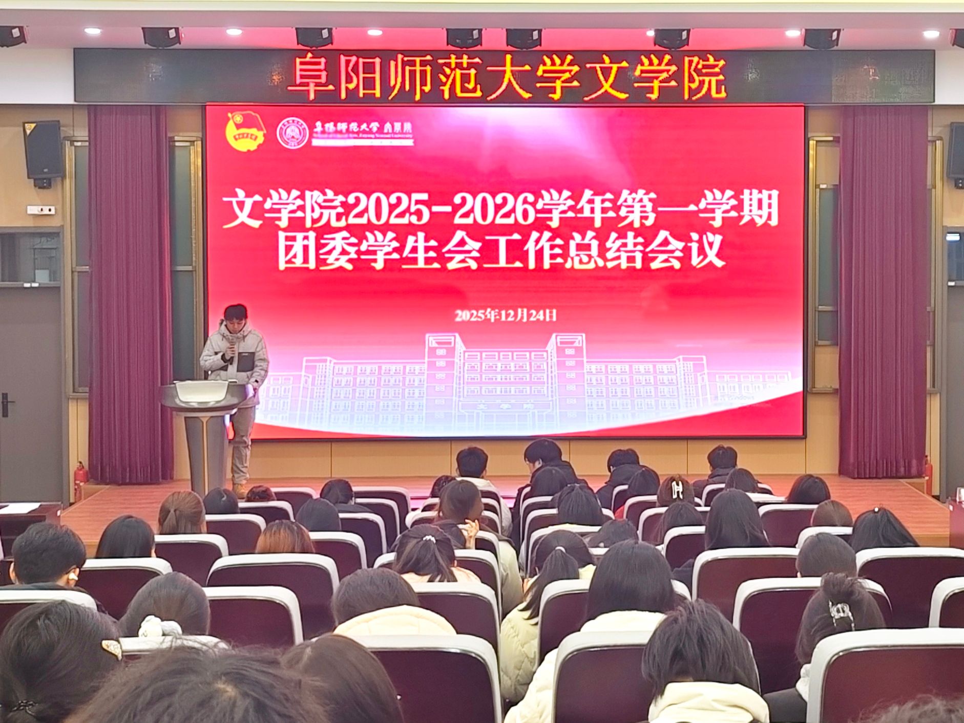 为系统总结学期工作成果,凝聚学生组织发展共识,2025年12月24日下午,文学院2025-2026学年第一学期团委学生会工作总结会议在三里桥校园C楼报告厅顺利召开。文学院团委负责人尚志会和全体团委学生会成员参加会议。