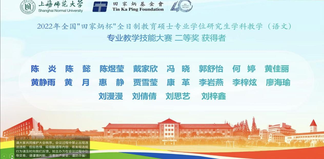 全国“田家炳杯”全日制教育硕士专业学位研究生教学技能大赛是极具规模的比赛,在本次比赛中,文学院2021级学科语文硕士研究生刘梓鑫同学以教学方式的创新、教学理念的独特及教学过程的生动喜获佳绩,这充分展现出我院学科语文硕士研究生扎实的专业技能和综合素养,体现我院在应用型人才培养方面的较高水平。