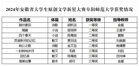 近日,2024年安徽省大学生原创文学新星大赛发布获奖名单。在此次比赛中,我校共有8位参赛选手凭借扎实的文学功底、独特的创作视角和深刻的情感表达,在众多作品中脱颖而出,斩获佳绩,其中一等奖1项、二等奖4项、三等奖3项,文学院金星老师荣获“优秀指导教师”称号。