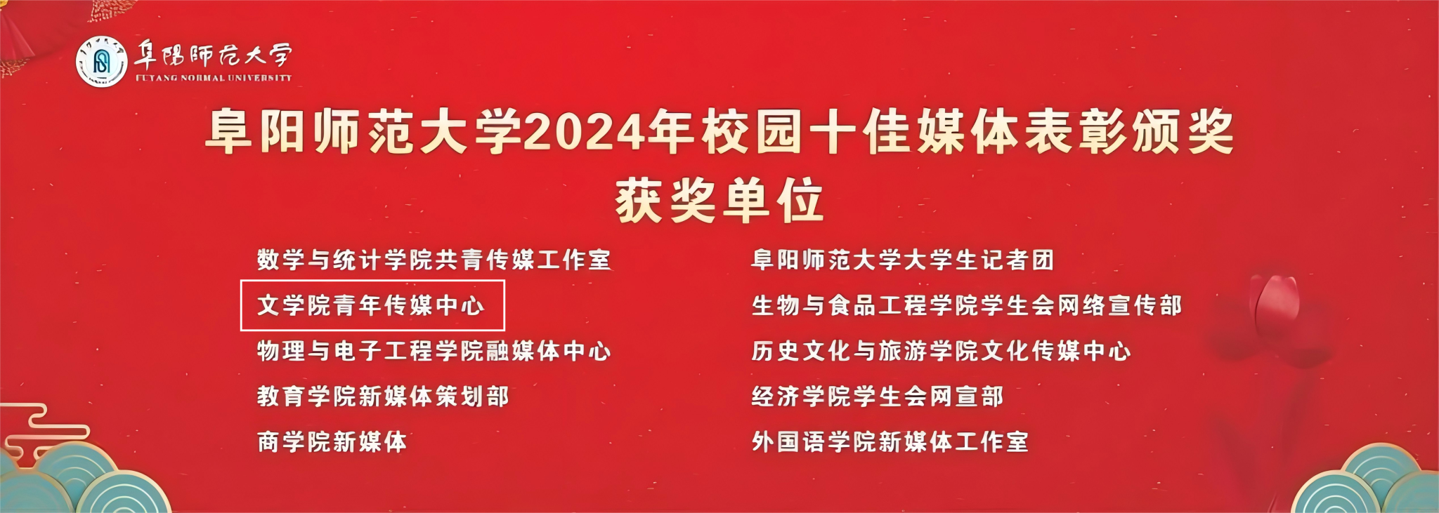 近日,文学院青年传媒中心在阜阳师范大学2024年校园十佳媒体评选中脱颖而出,荣获“校园十佳媒体”荣誉称号。