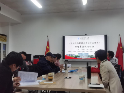 10月20日下午,教育部人文社科重点研究基地中国诗学中心阜阳师范大学分中心在景行楼826会议室召开《欧阳修苏轼颍州诗词详注辑评》增订本出版论证会。《阜阳日报》社资深编辑、国家一级作家王秋生、文学院副院长尹奇岭、诗学中心阜阳师范大学分中心副主任郑虹霓及古代文学专业全体教师参加了会议。论证会由郑虹霓主持。